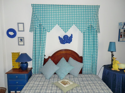 É muito simples em azul e branco e se não sair destas coisas de certeza que não erra e obtem um ambiente giro e fresco.